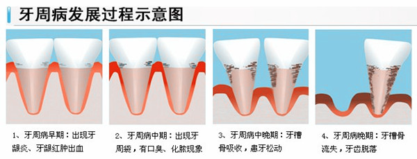 4、到牙周炎晚期牙龈会溢脓、牙龈萎缩肿痛,露牙根、牙垢多,口臭、牙齿松动、伸长、移位及疼痛发作等症状。
