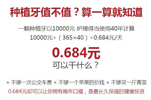 目前市场上关于种植牙的价格,少则七八千,多则上万。我们以中等偏上的价格10000元/每颗计算,维护得当使用年限40年(也就是14600天),这样算下来,每天只需0.68元。